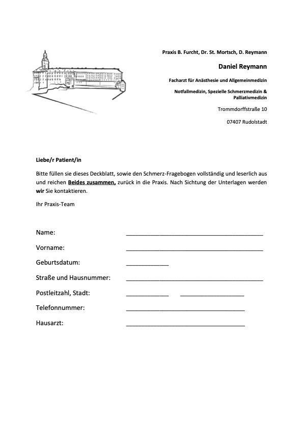 Für Folgetermine benötigen wir zuvor den ausgefüllten „Schmerzverlaufsfragebogen“ (6 Seiten).